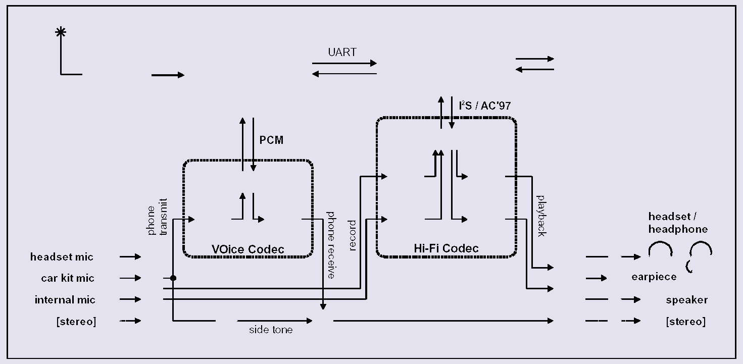 便攜式系統(tǒng)起初時還保持著自己的本來面目:個性CD、迷你唱碟和MP3播放器使用的是I2S DAC,移動電話保留了PCM技術(shù),而具有音頻增強功能的PDA一般采用同臺式計算機相同的AC 97 CODEC。因此,這簡直令人震驚,第一代組合系統(tǒng)通常含有電話和PDA兩塊電路板,兩者背靠背排列在一個機箱內(nèi),其PCM通話CODEC由通訊處理器進行控制,Hi-Fi立體聲(AC 97或I2S)CODEC則由應(yīng)用處理器進行控制。然而,CODEC根本就不是為這類應(yīng)用設(shè)計的,幾乎很少或者根本就沒有為這兩個音頻子系統(tǒng)之間的互聯(lián)互通做任何考慮。因此,工程師通常會在模擬信號路徑中插入一些分立的固態(tài)(solidstate)開關(guān),但是這也引入了噗噗聲、咔咔聲和諧波失真,并且占用PCB空間。