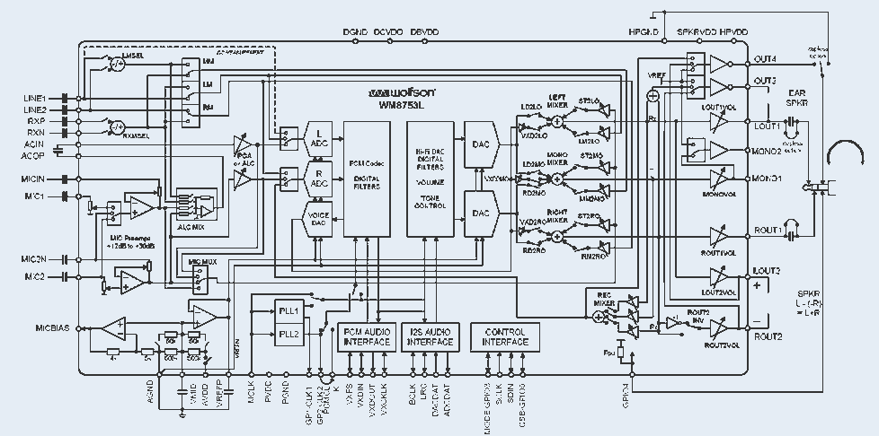 圖2 整合型智能電話CODEC方框圖,包括一個通話DAC、一個立體聲Hi-Fi DAC、以及兩個可以將信號路由到PCM或I2S接口的ADCs。其中,帶有前置放大器和路由功能的話筒輸入見左側(cè),混頻功能和輸出放大器見右側(cè)
