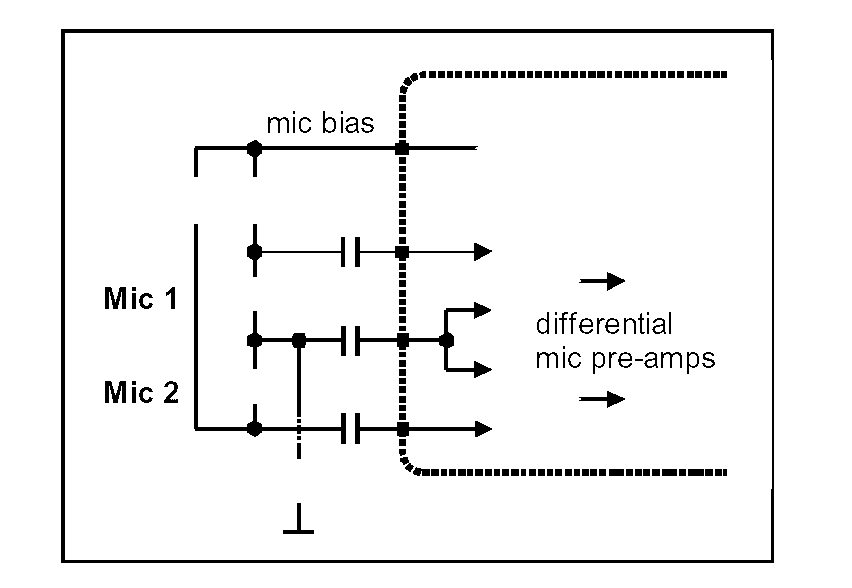 圖3 兩個話筒共享一個管腳,通過僅僅三個輸入管腳和一個話筒偏壓管腳,就可以實現(xiàn)兩個話筒與CODEC之間的差分連接