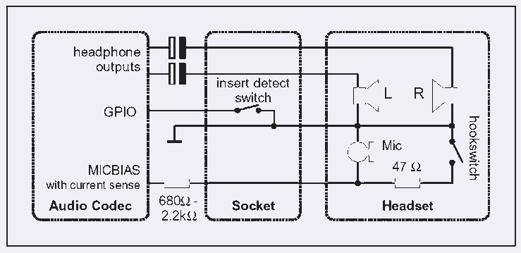 圖4 典型立體聲耳塞的內(nèi)部接線,以及插座插入檢測和話筒、hookswitch檢測的原理
