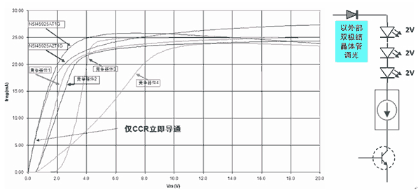 圖1:25mA的CCR與競爭器件的Ireg-Vin曲線比較(左);CCR調(diào)光應(yīng)用示例(右)。