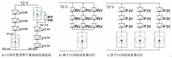 圖2:CCR可靈活用于高端或低端驅(qū)動(dòng),亦可驅(qū)動(dòng)多串LED。