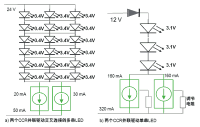 除了以單個(gè)CCR驅(qū)動(dòng)單串或多串LED,還能并聯(lián)多個(gè)CCR來提供更大電流,驅(qū)動(dòng)單串或多串LED。其中,使用三端可調(diào)節(jié)輸出CCR有助于滿足特定電流設(shè)置要求,可調(diào)節(jié)電阻能耗不到150mW。