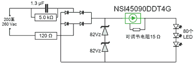 圖4:NSI45090DDT4G CCR在驅(qū)動(dòng)LED T8燈管應(yīng)用中的電路圖。