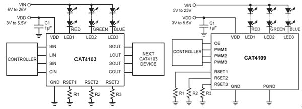 圖6:CAT4103及CAT4109 RGB像素LED驅(qū)動(dòng)器典型應(yīng)用電路圖。