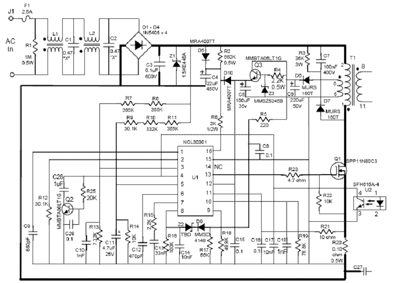圖2:NCL30001 CVCC 90W演示板初級(jí)側(cè)原理圖