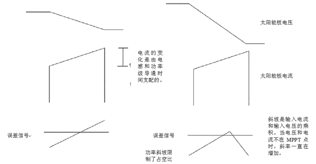 為了從功率可變的電源(即太陽能電池板)析取出最大的功率,太陽能控制器必須采用MPPT。MPPT必須首先找到最大功率點并及時調(diào)整環(huán)境條件,以保持控制器接近最大功率點。動態(tài)MPPT用在系統(tǒng)發(fā)生改變的情況下。由于每個開關(guān)周期都在發(fā)生變化,太陽能電池板汲取的功率也會在每個周期有明顯的改變。動態(tài)MPPT利用太陽能電池板的電壓驟降乘以每個開關(guān)周期增加的電流,以確定將要產(chǎn)生的誤差信號來調(diào)節(jié)占空比。動態(tài)響應(yīng)可檢測IV曲線的斜率,從而建立一個功率斜坡,從誤差信號相交點建立一個代表占空比的功率。當斜坡變化斜率從正到負時該周期結(jié)束,如圖2所示。