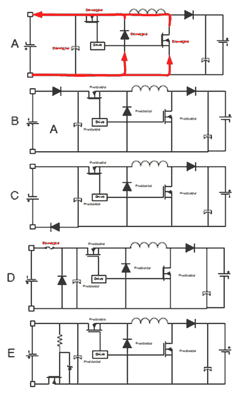 四開關(guān)非反相降壓-升壓有兩種操作模式,即降壓模式和降壓-升壓模式。在降壓模式下,轉(zhuǎn)換器產(chǎn)生輸入電壓脈沖,它經(jīng)過LC濾波來產(chǎn)生一個較低的直流輸出電壓。輸出電壓可以通過修改相對于開關(guān)周期或開關(guān)頻率的導(dǎo)通時間來改變。