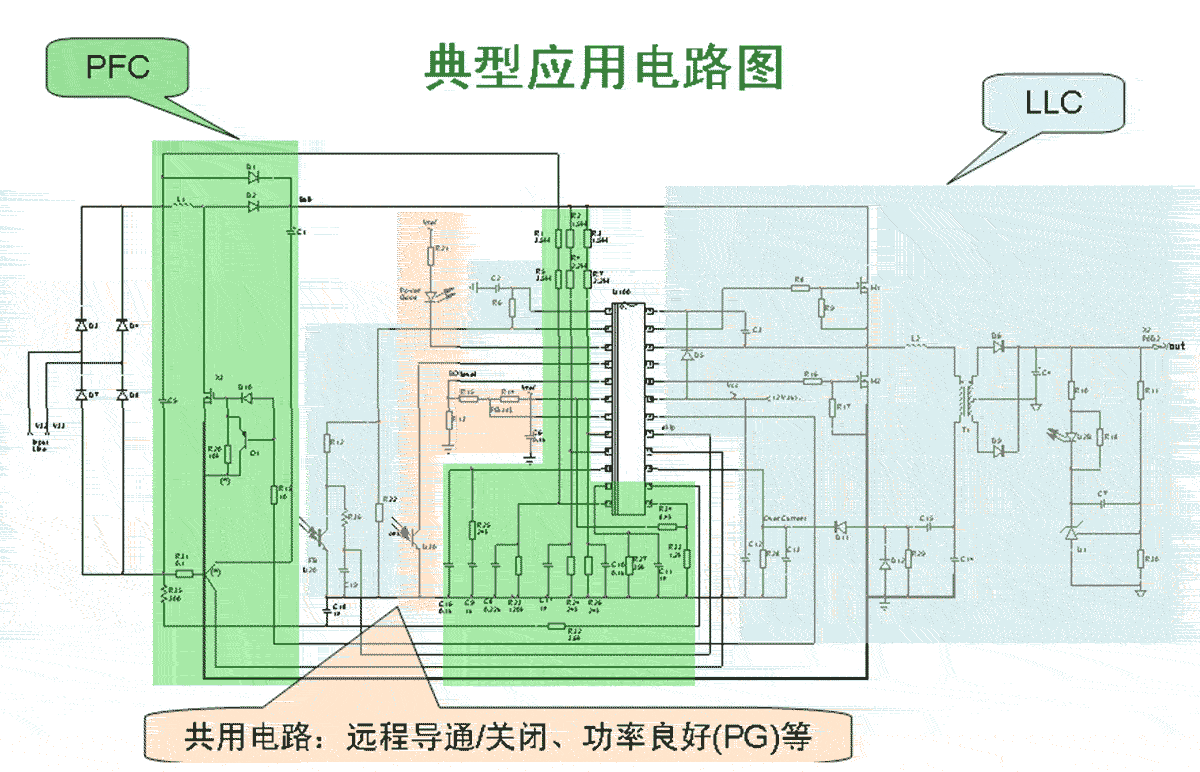 安森美半導(dǎo)體推出的NCP1910在單芯片中結(jié)合了PFC和LLC控制器,集成了這兩個轉(zhuǎn)換器所需的全部信號交換(handshaking)功能,既可提高可靠性,又可支持更簡單、更高密度的設(shè)計。NCP1910采用SOIC-24封裝,適用于高功率的ATX、一體機(jī)(all-in-one)及服務(wù)器、平板電視電源。圖1是采用NCP1910的典型應(yīng)用電路圖共用電路,它包括遠(yuǎn)程PFC段、LLC段,以及實(shí)現(xiàn)導(dǎo)通/關(guān)閉、功率良好(PG)等的共用電路。