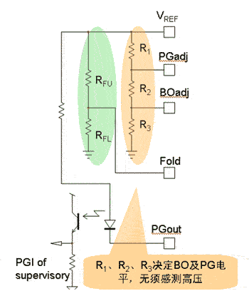 電路中的BO及PG電平是由R1、R2、R3決定的,無須感測高壓。BO電平在Vbulk電平(如300V,取決于電源系統(tǒng)的設(shè)計要求)時使LLC停止工作;PG電平在Vbulk電平時,器件通知次級端監(jiān)控電路,產(chǎn)生功率故障(Power Fail)信號;在PFC頻率反走輸入功率級時,PFC開始降低工作頻率。