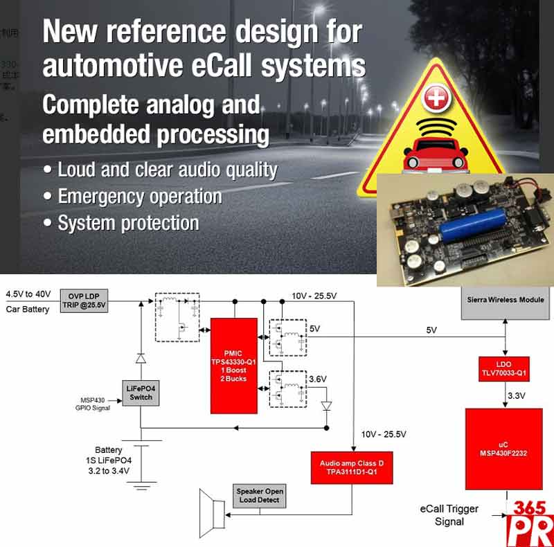 配備eCall系統(tǒng)的車輛將可在發(fā)生事故時向緊急服務(wù)中心撥打電話?蛻敉ㄟ^利用包含TI推出的AEC-Q100合格集成電路(IC)在內(nèi)的完整參考解決方案,能夠加快eCall系統(tǒng)的設(shè)計。