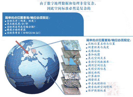 標(biāo)準(zhǔn)使軟件系統(tǒng)之間的空間數(shù)據(jù)通信變得可能。在你的智能手機(jī)響應(yīng)你有關(guān)街道地址的查詢時,或者在災(zāi)害響應(yīng)中心向龍卷風(fēng)沿途的電話和電視發(fā)送警告時,由眾多標(biāo)準(zhǔn)組織定義的標(biāo)準(zhǔn)集將發(fā)揮作用?臻g標(biāo)準(zhǔn)團(tuán)體關(guān)注位置數(shù)據(jù)的統(tǒng)一編碼問題,以及定義準(zhǔn)確、一致的業(yè)務(wù)接口的使用問題,這些接口與查找、訪問和調(diào)用基于位置的服務(wù)和相關(guān)數(shù)據(jù)有關(guān)。這些標(biāo)準(zhǔn)正發(fā)揮著重要的作用,例如,在互聯(lián)網(wǎng)瀏覽器接受你的路標(biāo)并創(chuàng)建一幅地圖以顯示你所采用的路線時,或者在它將該地圖疊加到一幅地球圖像或一幅三維等高線地圖上時。