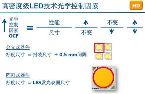 科銳指出作為L(zhǎng)ED照明核心部件的LED封裝器件,將朝著尺寸越來(lái)越小,性能越來(lái)越高的方向前進(jìn)?其J將LED封裝器件性能/LED器件尺寸定義為OCF(Optical Control Factor,光學(xué)控制因素),用以衡量LED封裝器件為L(zhǎng)ED照明生產(chǎn)商所帶來(lái)的價(jià)值。當(dāng)光學(xué)控制因素OCF越高(LED封裝器件性能越高 & LED封裝器件尺寸越小,或LED封裝器件性能越高 & LED封裝器件尺寸不變,或LED封裝器件性能不變 & LED封裝器件尺寸越。⿻r(shí),我們?cè)趩挝怀叽鐑?nèi)將能夠獲得更為優(yōu)異的性能,并帶來(lái)更高的價(jià)值。