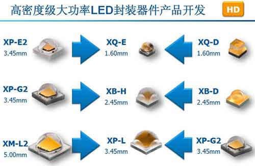 在高密度級(jí)大功率LED封裝器件產(chǎn)品開(kāi)發(fā)方面,科銳目前推出了XLamp XP-L LED、XLamp XB-H LED、XLamp XQ-E LED等三款產(chǎn)品,在保證優(yōu)異光品質(zhì)的前提下,使得更小尺寸的LED封裝器件實(shí)現(xiàn)了更高的光效和流明輸出。例如,科銳XLamp XB-H LED綜合了前代產(chǎn)品XLamp XP-G2 LED的性能和XLamp XB-D LED的封裝尺寸,設(shè)立了大功率LED器件的新標(biāo)桿。XLamp XB-H LED的封裝尺寸僅為2.45×2.45mm,在溫度25°C和功率1W條件下能夠提供最高可達(dá)175lm/W光效。與同樣性能水平的XLamp XP-G2 LED相比,XLamp XB-H LED的封裝尺寸僅為其50%。而與同樣封裝尺寸的XLamp XB-D LED相比,XLamp XB-H LED在相同光效條件下的流明輸出是其3倍。擁有高光學(xué)控制因素OCF的XLamp XB-H LED能夠?yàn)檎彰魃a(chǎn)商提供更高亮度和更好光學(xué)控制,從而幫助在不犧牲可靠性的前提條件下提高設(shè)計(jì)靈活性、提升性能、降低系統(tǒng)成本。