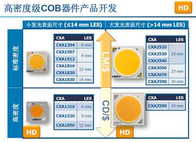 在高密度級(jí)COB器件產(chǎn)品開(kāi)發(fā)方面,科銳目前推出了XLamp 1310 LED、XLamp 1520 LED、XLamp 1850 LED、XLamp 2590 LED。在優(yōu)異光品質(zhì)的前提下,使得更小發(fā)光面(LES)尺寸的COB器件實(shí)現(xiàn)了更高的中心光強(qiáng)和流明輸出。例如,科銳XLamp CXA1850 LED綜合了前代產(chǎn)品XLamp CXA3050 LED的性能和XLamp CXA1820 LED的發(fā)光面(LES)尺寸,設(shè)立了COB器件新的標(biāo)桿。XLamp CXA1850 LED的發(fā)光面(LES)尺寸僅為12mm,光通量超過(guò)9,000lm,能夠使得LED照明解決方案在保持與70W陶瓷金鹵燈相同中心光強(qiáng)和光品質(zhì)的前提下,功率消耗降低一半。與同樣性能水平的XLamp CXA3050 LED相比,XLamp CXA1850 LED的發(fā)光面(LES)尺寸僅為其50%。而與同樣發(fā)光面(LES)尺寸的XLamp CXA1820 LED相比,XLamp CXA1850 LED在相同光效條件下的流明輸出是其2倍。
