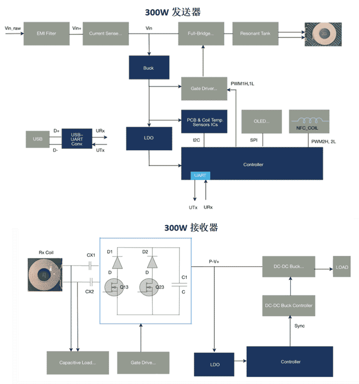 線圈參數(shù)可在生產(chǎn)線上組裝時(shí)進(jìn)行校準(zhǔn)。這種解決方案的優(yōu)勢(shì)在于,可在產(chǎn)品測(cè)試期間將線圈校準(zhǔn)數(shù)據(jù)寫入WP300TX IC,從而實(shí)現(xiàn)整個(gè)產(chǎn)品的一致操作和可靠性能。最后,為在發(fā)送器和接收器之間創(chuàng)建1:1配對(duì),可在帶內(nèi)包含安全通信,以確保只有經(jīng)過發(fā)送器驗(yàn)證的接收器才能獲得供電。圖4包含經(jīng)優(yōu)化可提供這些功能的300W發(fā)送器控制器和300W接收器控制器的框圖。