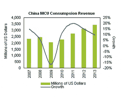 隨著經(jīng)濟(jì)復(fù)蘇和電子設(shè)備需求回升,中國(guó)MCU市場(chǎng)將在2010年復(fù)蘇。iSuppli公司預(yù)測(cè),2010年中國(guó)MCU消費(fèi)額將增長(zhǎng)到23億美元,比2009年增長(zhǎng)11.3%。