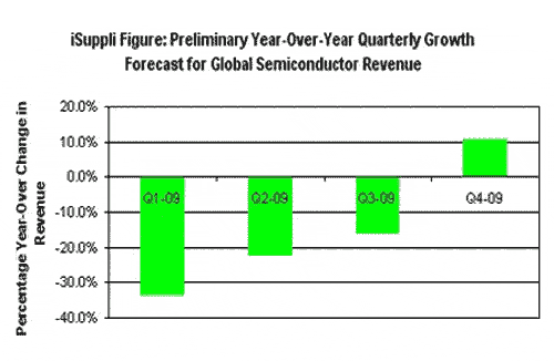 【產(chǎn)通社,11月1日】市場調(diào)研公司iSuppli數(shù)據(jù)顯示,盡管預(yù)計2009年全球半導(dǎo)體銷售額連續(xù)第二年下降,但第四季度有望恢復(fù)季度同比增長,這標志著該行業(yè)復(fù)蘇的開始。正如iSuppli公司先前宣布的預(yù)測,2009年全球半導(dǎo)體銷售額將萎縮16.5%。而在此之前,2008年下降了5.4%。