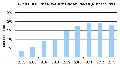 iSuppli公司預(yù)計(jì)2009年,中國灰色手機(jī)市場(chǎng)出貨量將達(dá)到1.45億部,比2008年時(shí)的1.01億部激增43.6%。這將是規(guī)模為11.3億部的全球合法手機(jī)市場(chǎng)的12.9%;疑袌(chǎng)今年有望接近2005年3700萬部的四倍。與此相反,2009年全球合法手機(jī)市場(chǎng)出貨量將下降8%。
