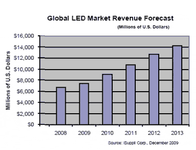 2009年全球LED營業(yè)收入將增長10.9%,從2009年的67億美元上升到74億美元。這與總體半導(dǎo)體市場形成了鮮明的對比,預(yù)計后者2009年將因全球經(jīng)濟放緩而萎縮12.4%。到2013年,全球LED市場將達(dá)到143億美元,比2009年增長近一倍。