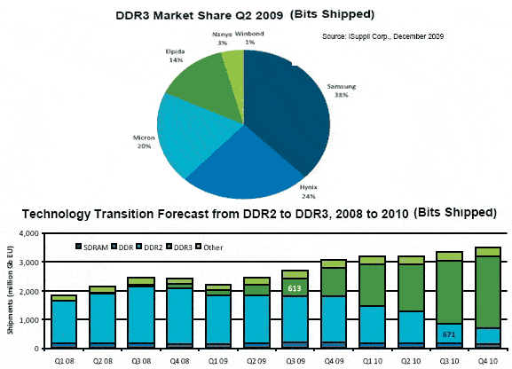 但是,DDR2短期內(nèi)不會退出市場,預(yù)計2010年出貨量將超過35億個Gb。不僅DDR2明年一直會大量出貨,而且2010年第三季度比特出貨量會與DDR3的2009年第三季度出貨量相當(dāng)。因此,雖然向DDR3的過渡已經(jīng)開始,但不會立即完成。