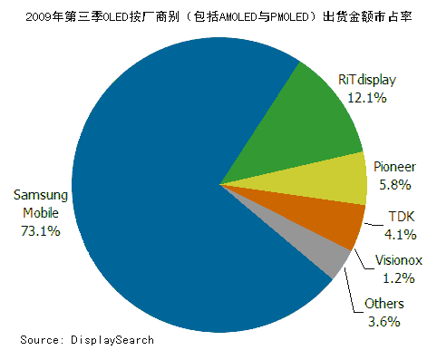 以AMOLED供貨商中,SMD為主要領(lǐng)導(dǎo)廠商,無論是出貨量或出貨金額均遙遙領(lǐng)先其它廠商;第三季SMD更以73%市占率(以出貨金額計(jì)算)稱霸市場;而RiTdisplay(錸寶科技)以12%市占率位居第二。另LG Display也宣布15寸AMOLED TV在2009年第三季進(jìn)入量產(chǎn)階段。