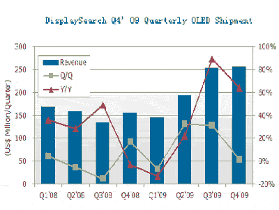 根據(jù)DisplaySearch最新發(fā)表季度OLED(有機(jī)發(fā)光二極管顯示面板)最近出貨調(diào)查指出,三星電信持續(xù)積極地推廣采用AMOLED面板手機(jī)的好處,也推進(jìn)了消費(fèi)者的接受度。在2009年第三季OLED產(chǎn)業(yè)有幾個(gè)主要整并事件發(fā)生,如Eastman Kodak將OLED顯示事業(yè)賣給樂金電子,另外InnoLux(群創(chuàng))合并了CMO(奇美)與TPO(統(tǒng)寶),其中包括了OLED制造。