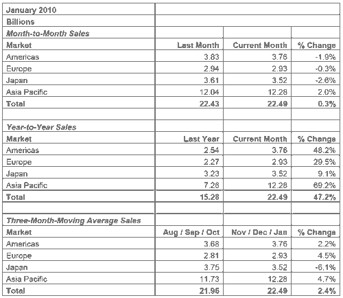 【產(chǎn)通社,3月3日】美國半導體協(xié)會(Semiconductor Industry Association,SIA)網(wǎng)站消息,今年1月全球半導體銷售額達225億美元,同比2009年1月的153億提高了47.2%,環(huán)比上個月的224億也上升0.3%。