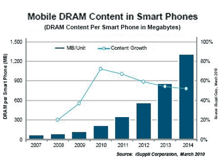 iSuppli公司表示,未來(lái)幾年智能手機(jī)使用的DRAM平均數(shù)量將增長(zhǎng)九倍以上,到2014年將從2009年的123MB增長(zhǎng)到1.3GB。雖然智能手機(jī)和多功能手機(jī)2009年第一季度合計(jì)占手機(jī)出貨量的70%以上,到2011年底時(shí)該比例將上升到80%。