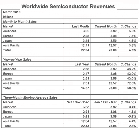 【產(chǎn)通社,5月5日】世界半導體產(chǎn)業(yè)協(xié)會(Semiconductor Industry Association,SIA)表示,在計算和通信市場強勁需求的推動下,3月份全球半導體銷售收入為231億美元,比2月份增長了4.6%。3月份的數(shù)字顯示了芯片市場正在強勁地復蘇,不過該增長也讓人擔心半導體芯片會供過于求。