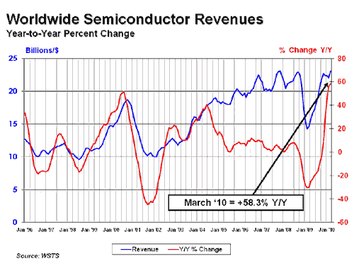資料顯示,第一季全球半導體市場銷售收入是692億美元,而2009年第一季全球半導體市場的銷售收入是437億美元。2009年第一季是全球經(jīng)濟衰退期間的半導體市場的低點。