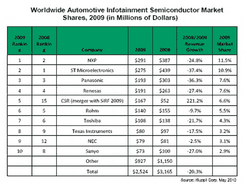 【產(chǎn)通社,5月7日】恩智浦半導體(NXP)2009年在全球汽車信息娛樂半導體市場排名第一,這是iSuppli公司從2005年開始追蹤該市場以來的第一次。