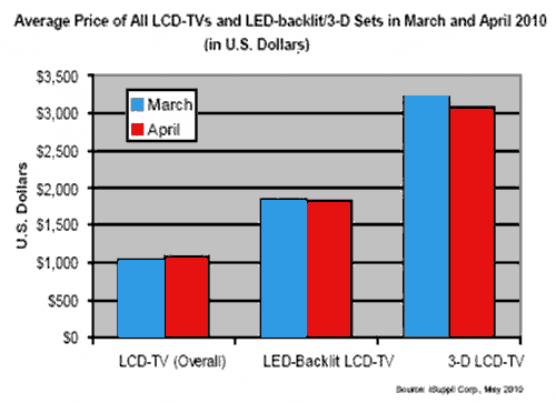 相比之下,LED背光液晶電視的平均價格在4月份降至1830美元,比3月的1844美元下降0.8%。同期3D液晶電視的價格降到3075美元,比3月時的3230美元下跌4.8%。