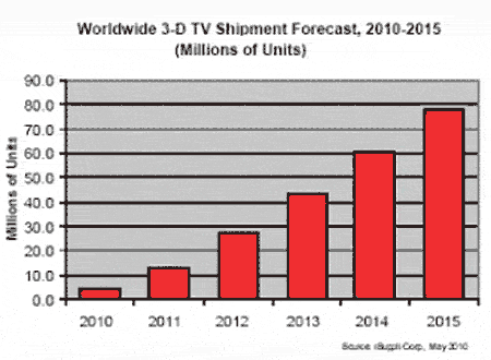 iSuppli公司,在2010年第一季度購買新電視的美國消費者中,4%稱其購買的是支持3D的電視,其中60%購買的是3D液晶電視,其余的40%購買的是3D等離子電視。4月份,26款電視具有3D功能,而3月時是23款。