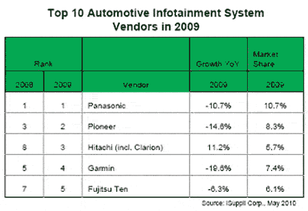 另一家日本一線供應(yīng)商日立2009年排名第三。該公司2008年排名第八,是2009年10大廠商中營業(yè)收入增長的兩家廠商之一。日立2007年與Clarion Co. Ltd.合并,合并營業(yè)收入2009年占全球信息娛樂市場的5.7%。