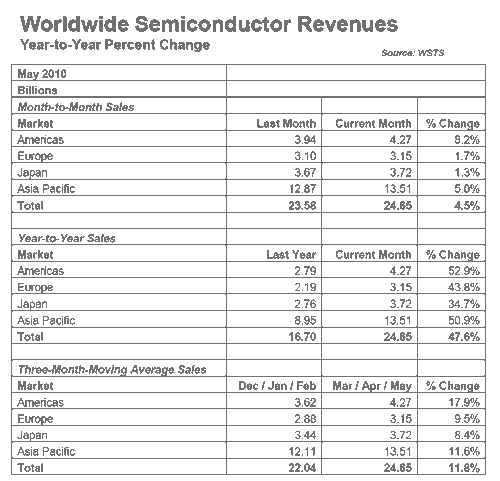 SIA總裁George Scalise表示,全球半導(dǎo)體5月銷售額創(chuàng)新高,與SIA近期公布的2010年全年增長28.4%并實(shí)現(xiàn)2905億美元銷售的預(yù)測(cè)保持同步。而推動(dòng)芯片銷售增長的動(dòng)力則主要來自個(gè)人電腦(PC)、手機(jī)、企業(yè)信息技術(shù)(corporate information technology)、工業(yè)應(yīng)用,以及汽車領(lǐng)域。