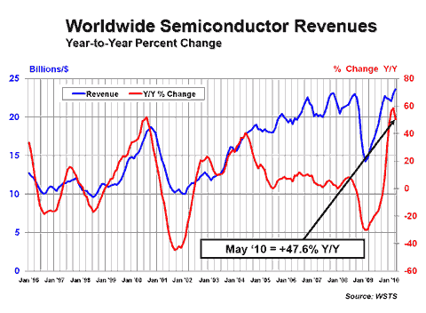 SIA再次重申,在2010下半年里,全球半導(dǎo)體的成長性無論是同比和環(huán)比增長率都可能下降。盡管近期半導(dǎo)體市場(chǎng)需求旺盛,這是由于2009年上半年受金融危機(jī)影響受壓所制,未來工業(yè)將回復(fù)到基本面,所以增長率會(huì)減速。