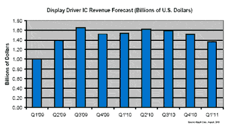 最新的不利預(yù)測暗示,顯示器驅(qū)動IC將維持起伏不定的命運。顯示器驅(qū)動IC用于為液晶、OLED和等離子等平板顯示器提供電壓或驅(qū)動信號。繼經(jīng)濟衰退之后,2009年該市場表現(xiàn)疲軟,接著在2010年上半年強勁反彈,今年稍晚和2011年初則預(yù)計降溫。