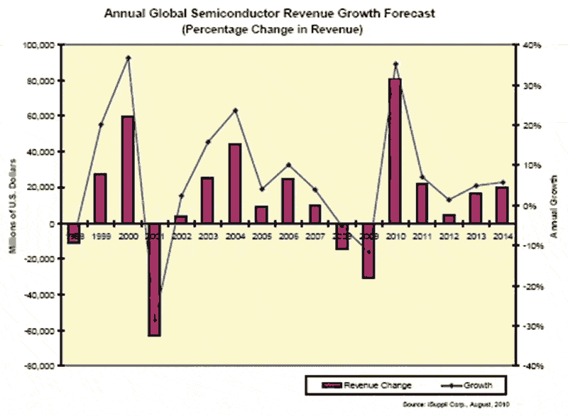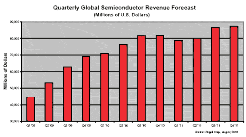 iSuppli公司預(yù)測,半導(dǎo)體產(chǎn)業(yè)將連續(xù)增長七個季度,然后在2011年第一季度出現(xiàn)季節(jié)性下降。 這將是該產(chǎn)業(yè)在1991至1995年期間連續(xù)增長19個季度之后,連續(xù)增長時間最長的一次。