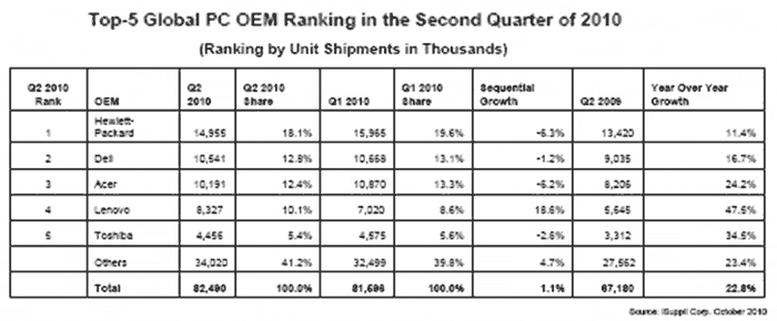 iSuppli公司的最新全球PC預(yù)測認為,2010年單位出貨量增長15%。第二季度惠普連續(xù)第16個季度穩(wěn)居全球頭號PC品牌,市場份額為18.1%。