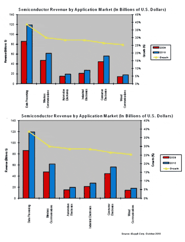 2010年即使增長(zhǎng)最慢的市場(chǎng),半導(dǎo)體消費(fèi)預(yù)計(jì)也會(huì)取得令人矚目的增長(zhǎng)。有線通訊和消費(fèi)電子2010年半導(dǎo)體銷售額將分別增長(zhǎng)25.4%和26.5%。