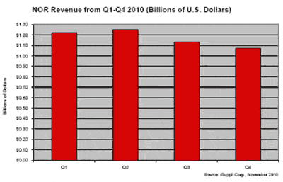 綜合來看,第三與第四季度的情況顯示,相對于上半年的強勁表現(xiàn),NOR閃存市場在2010年下半年走軟。