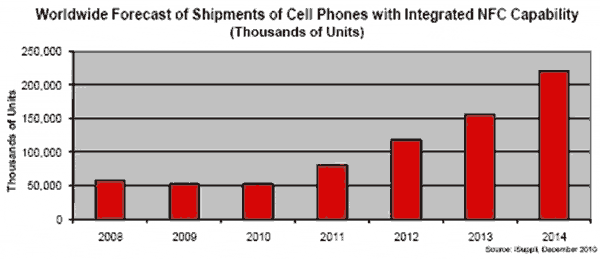 2014年全球具有內(nèi)置NFC功能的手機(jī)出貨量將是2010年的四倍,從5260萬部增長到2.201億部。2014年出貨的手機(jī)中,將有13%具備NFC功能,2010年該比例是4.1%。