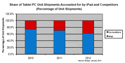 2011年全球平板電腦出貨量預計是2010年的三倍多,從1710萬臺增長到5760萬臺。盡管蘋果未來一年仍將占據(jù)統(tǒng)治地位,平板電腦出貨量份額高達70.4%,但該公司將面臨來自新對手日益強烈的競爭。這些新來者生產(chǎn)消費平板電腦,包括三星電子、惠普、Research in Motion Ltd.、戴爾和眾多其它公司。但在目前,預計蘋果未來兩年仍將在平板電腦市場占最大份額。