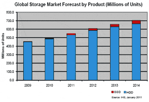 【產(chǎn)通社,1月21日訊】隨著全球經(jīng)濟復(fù)蘇,對于存儲產(chǎn)品的需求上升,HDD和SSD都將從中受益。IHS iSuppli公司預(yù)計,包括硬盤(HDD)在內(nèi)的全球存儲產(chǎn)品出貨量2011年增長10%以上。其中,HDD與固態(tài)硬盤(SSD)的合計出貨量2011年將增長到5.472億個,比2010年的4.93億增長10.9%。