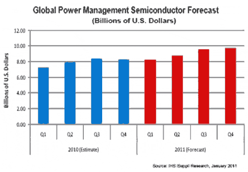2010年該市場(chǎng)強(qiáng)勁增長(zhǎng),電源管理半導(dǎo)體銷(xiāo)售額從2009年的225億美元大增到318億美元。由于2010年急劇增長(zhǎng),2011年增長(zhǎng)速度將會(huì)下降。2011年銷(xiāo)售增長(zhǎng)速度將難以保持2010年那樣強(qiáng)勁。2009年產(chǎn)業(yè)衰退,2010年銷(xiāo)售額急劇反彈。