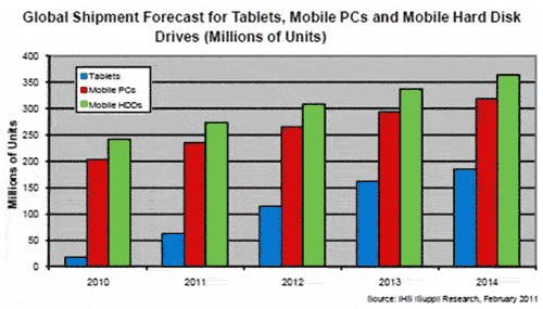 IHS iSuppli公司預(yù)計(jì),2011年使用HDD的移動(dòng)PC出貨量(包括筆記本電腦和上網(wǎng)本),將達(dá)到2.35億臺(tái),比去年的2.04億增長(zhǎng)15.2%。相比之下,平板電腦出貨量今年將跳增到6300萬臺(tái),2010年是1700萬臺(tái)。盡管2011年平板電腦預(yù)計(jì)大增270.6%,但難以侵蝕HDD在存儲(chǔ)產(chǎn)業(yè)所牢牢控制的地盤。