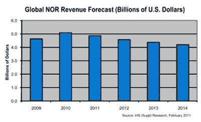 預(yù)計(jì)2011年NOR閃存營(yíng)業(yè)收入從去年的51億美元降到46億美元。去年是該產(chǎn)業(yè)自2004年以來(lái)表現(xiàn)最好的一年,增長(zhǎng)了10.9%,受益于經(jīng)濟(jì)強(qiáng)勁復(fù)蘇。由于NOR進(jìn)入更多的應(yīng)用領(lǐng)域,其出貨量將保持增長(zhǎng),但平均銷售價(jià)格(ASP)不斷下降。這將導(dǎo)致NOR營(yíng)業(yè)收入繼續(xù)受挫,未來(lái)幾年呈下滑趨勢(shì)。