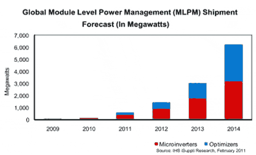 預(yù)計(jì)2014年全球MLPM出貨量將從160MW增長到6.2GW,增長近39倍。MLPM包括微型變頻器和優(yōu)化器。到2014年底,全球38%的住宅PV裝置將使用MLPM解決方案,而2010年該比例是2%。