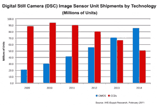 2013年用于數(shù)碼相機(jī)(DSC)的CMOS圖像傳感器出貨量將達(dá)到7110萬個,而2010年是3070萬個。同時,2013年CCD出貨量將從2010年的9410萬個下降到6690萬個。到2014年,數(shù)碼相機(jī)CMOS的出貨量將超過8500萬個,而CCD是5100萬個。